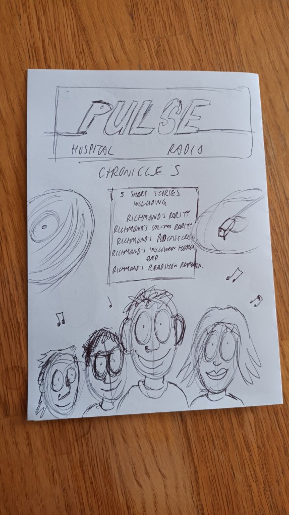Been working on a design for my upcoming compilation of Pulse Hospital Radio Chronicles (5 short stories and a prequel). It never gets any easier to design covers it seems. You’d think being an artist and writer would make it easier, but I suppose it’s the same as the issue of writing my own blurbs: I’m too close to the work to see what the core of the story is, both visually and plot wise. I’ll get there. Sometimes it’s a case of doing a few designs and cherry picking what I like about them, then combining them to make the ideal cover. I quite like the logo for the radio station at the head of the design, so that’s a start, I suppose.